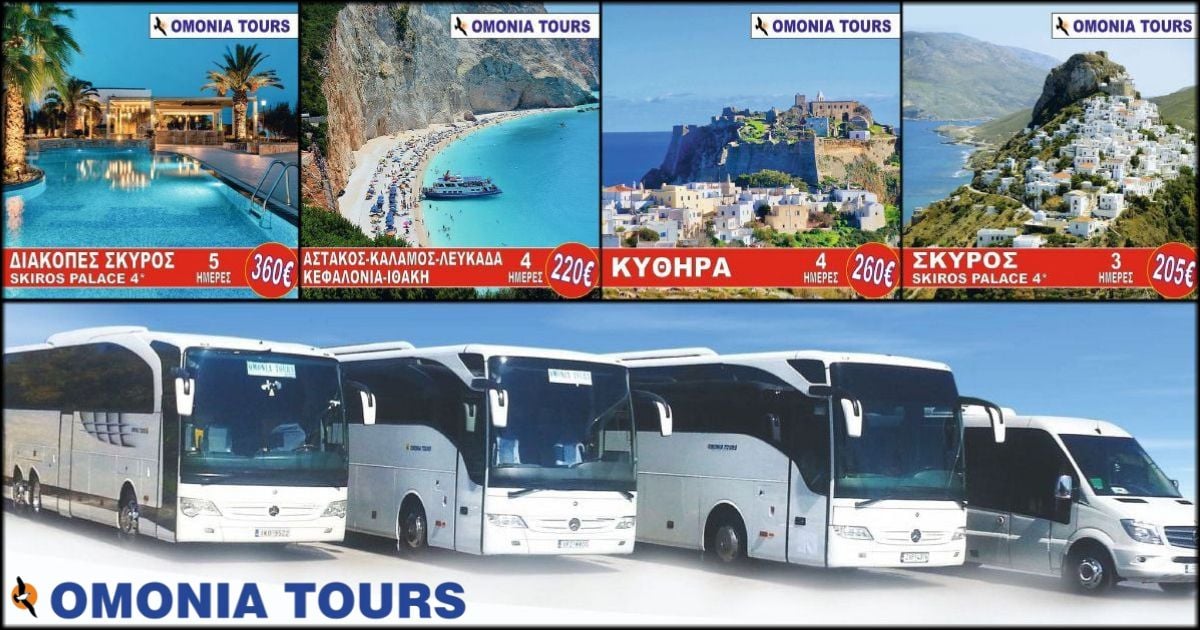 Πολυήμερες και ημερήσιες εκδρομές για να περάσετε ένα υπέροχο καλοκαίρι στην πανέμορφη Ελλάδα μας! Πάντα ποιότητα και άριστες τιμές με την εγγύηση του Omonia Tours!
